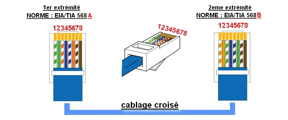 Il en existe deux principales correspondant à l’appellation T568A et T568B. Concrêtement, ces deux normes sont structurés en Quatre paires de fil. La différence est une inversion de position entre la paire verte/blanc-vert et Orange/blanc-orange. Voici une représentation ci-contre des deux normes en extrémité de câbles: