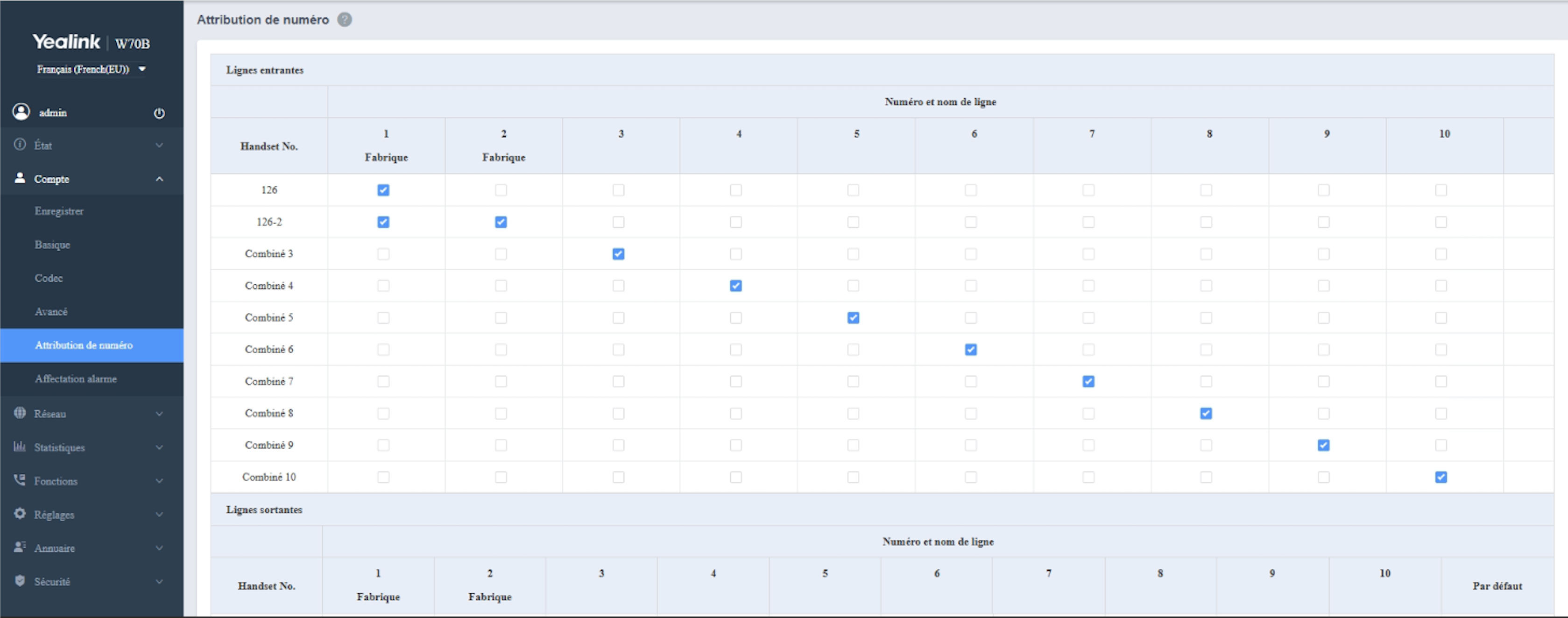 Sur cet écran vous pouvez cocher quels combinés sonnent lors de l’appel d’un numéro de ligne ou Extension défini dans la base DECT. (il est possible d’associer jusqu’à 10 comptes également à une base DECT)